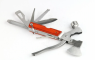 Excelente herramienta multipropósito 16 funciones plegable, fabricada en acero inoxidable con mango de madera. Incluye estuche protector para portar en cinturón.